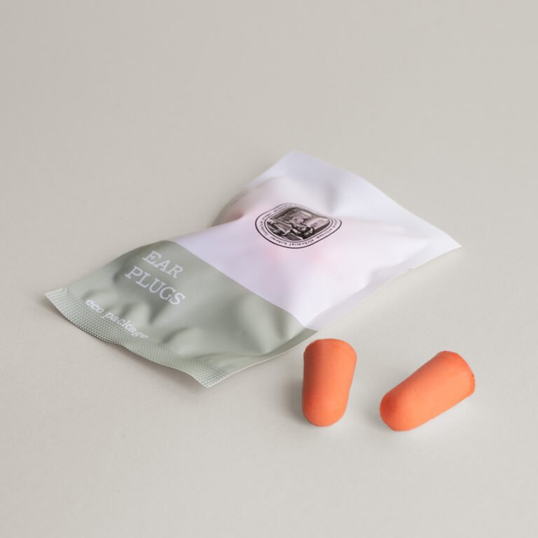 Earplug in paper sachet Plastic-free paper sachet, printed with soy ink.