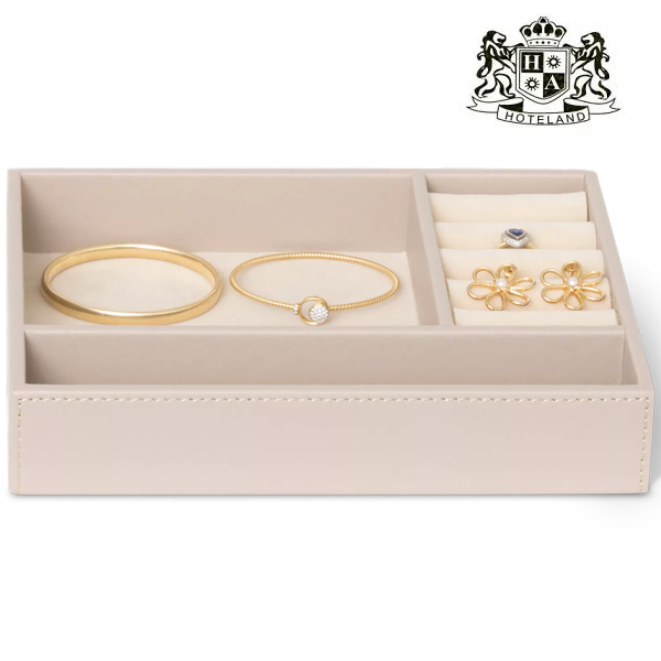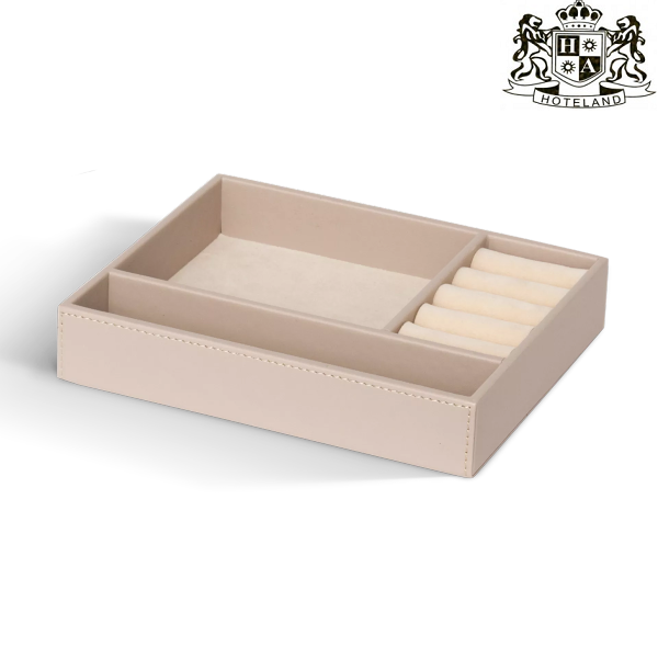 The Andros Jewellery Tray in Natural is a luxurious accessory for any discerning guest. Crafted with a natural-coloured fabric and fine stitching, this tray is perfect for elegantly displaying jewellery and watches. Its design ensures suitability for most hotel safes, while the water-repellent and easy-to-clean surface makes it a practical choice for maintaining a pristine presentation.