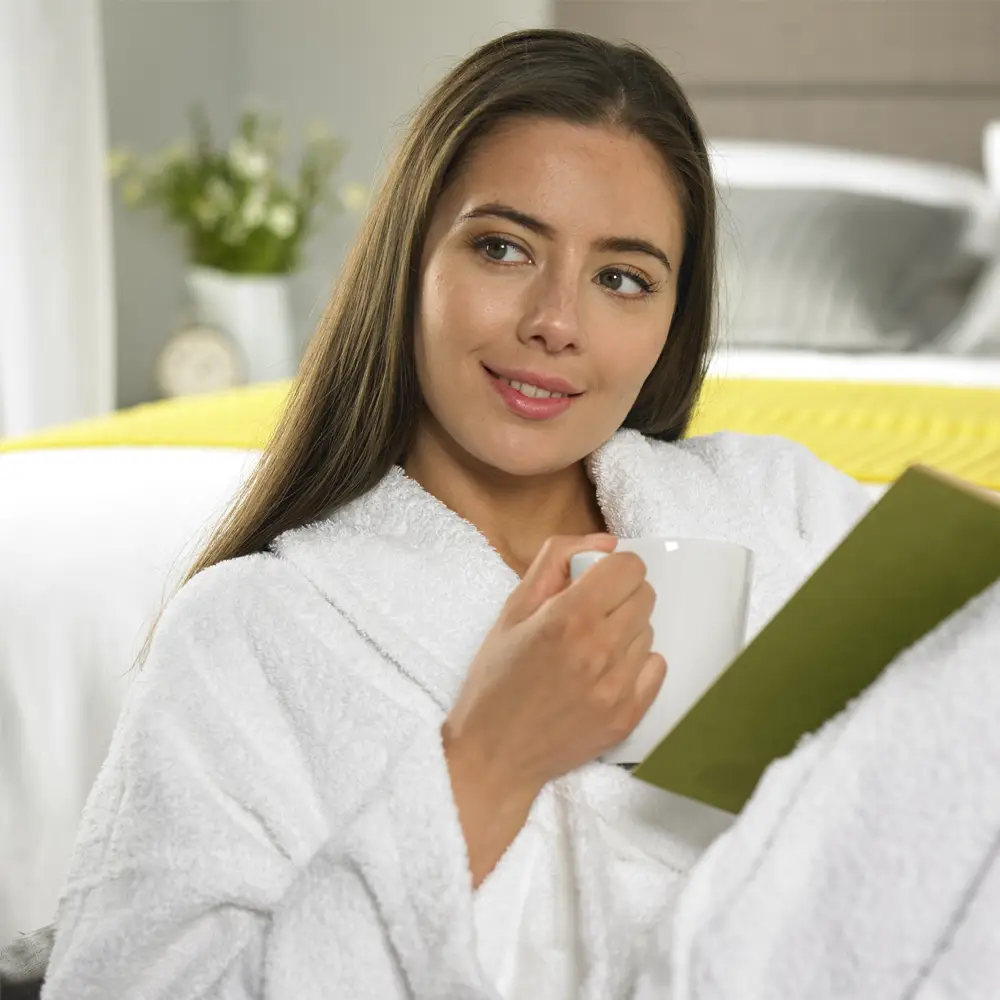 Μπουρνούζι από 100% velour cotton 400 gr/m2, με εξαιρετικά απαλή αίσθηση και μεγάλη απορροφητικότητα. Είναι ιδανικό για να αγκαλιάζει το σώμα μετά το μπάνιο ή το ντους προσφέροντας πολύ άνετο και γρήγορο στέγνωμα. Έχει όμορφο σχέδιο με γιακά, και φαρδιά πατιλέτα στο φινίρισμα. Η ζώνη το τελείωμα της τσέπης και η μανσέτα στο μανίκι έχουν πενταγαζο τελείωμα ώστε να δίνουν σταθερότητα ακόμα και μετά από πολλές πλύσεις. Χάρη στη φυσική βαμβακερή του σύνθεση είναι υποαλλεργικό, αντιστατικό και το ύφασμά του αναπνέει και στεγνώνει εύκολα.